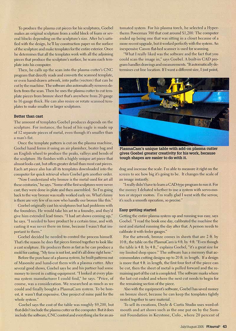 The article below was published by FF Journal magazine July/August 2005 to describe how Doyle Gobel uses the PlasmaCAM in his business: